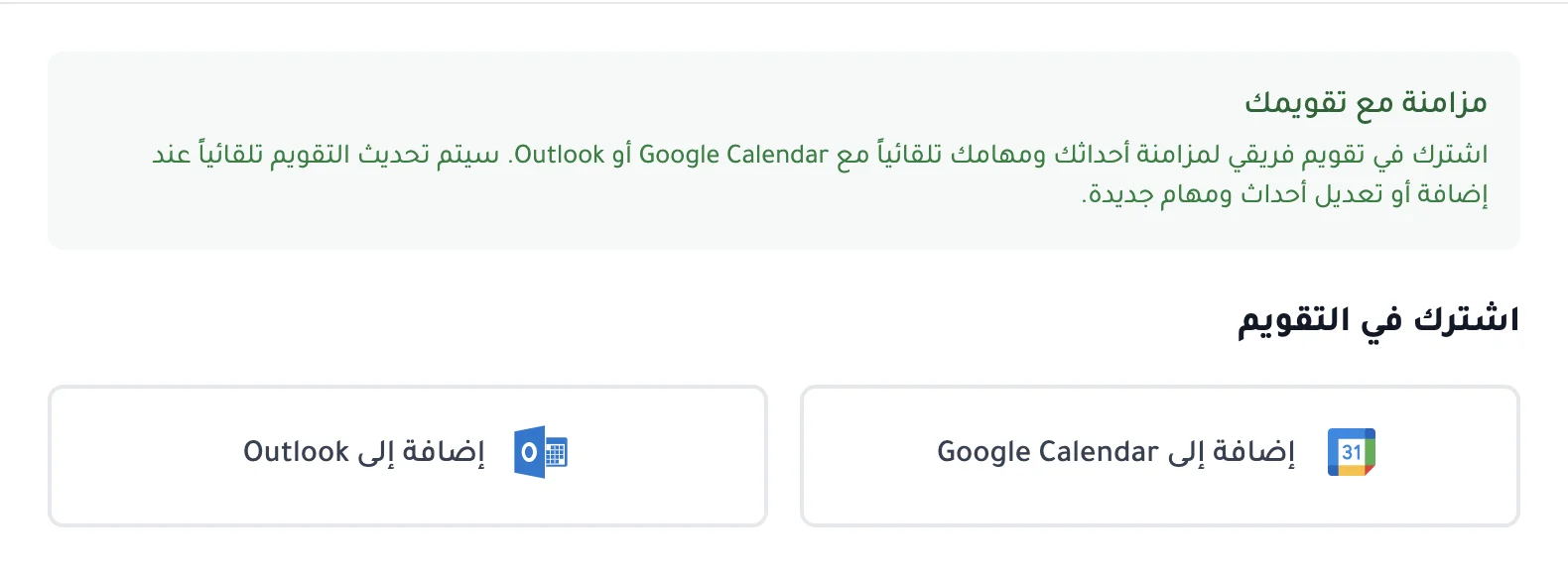 وعشان ما تضطر تتنقل بين تقويمات مختلفة، تقدر تزامن أحداثك مع Google Calendar أو Outlook أو Apple Calendar أو أي تقويم يدعم iCal. أي حدث تضيفه في فريقي يظهر في تقويمك الشخصي تلقائياً، والعكس صحيح.