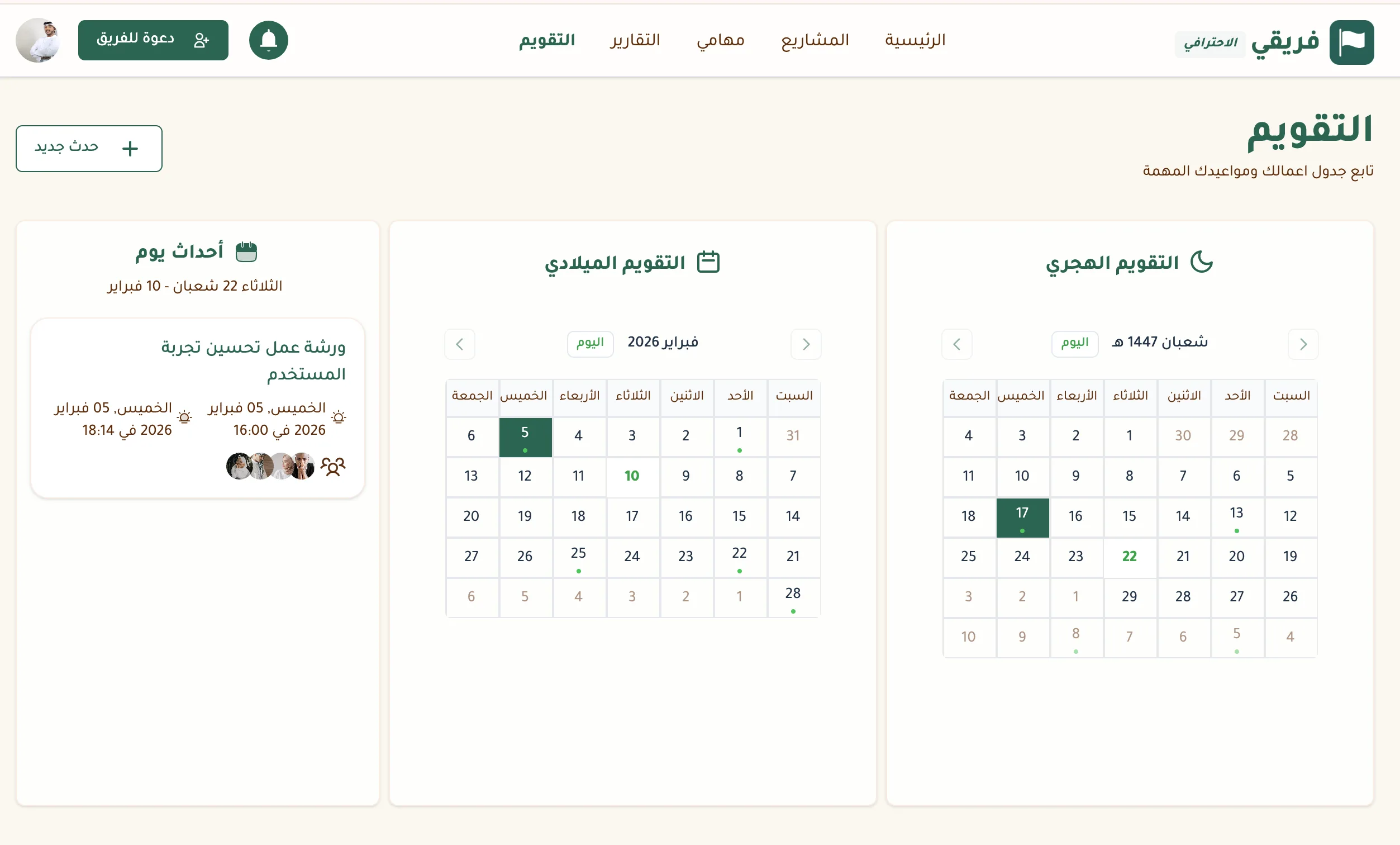 تقويم فريقي يجمع كل شيء في مكان واحد. التقويم الهجري والميلادي يشتغلون مع بعض في واجهة واحدة، ومواعيد تسليم المهام والاجتماعات تظهر تلقائياً. شوف جدولك اليومي أو الأسبوعي أو الشهري بنظرة واحدة.