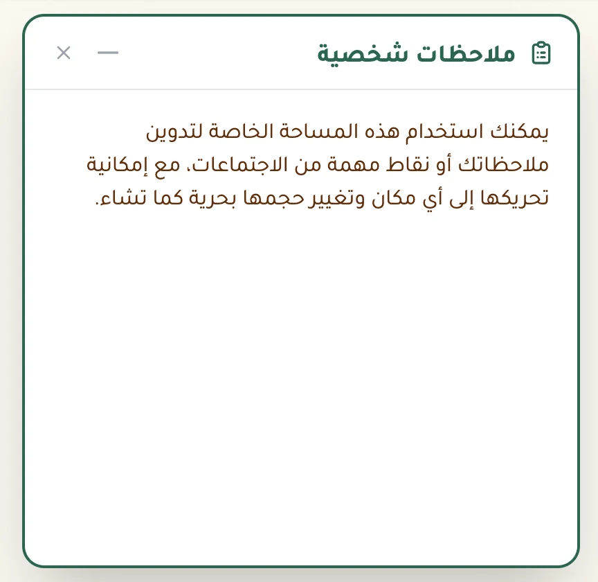 دوّن أفكارك وملاحظاتك في مساحة خاصة بك داخل المنصة. لا يراها أحد غيرك، وتبقى في متناولك دائماً.